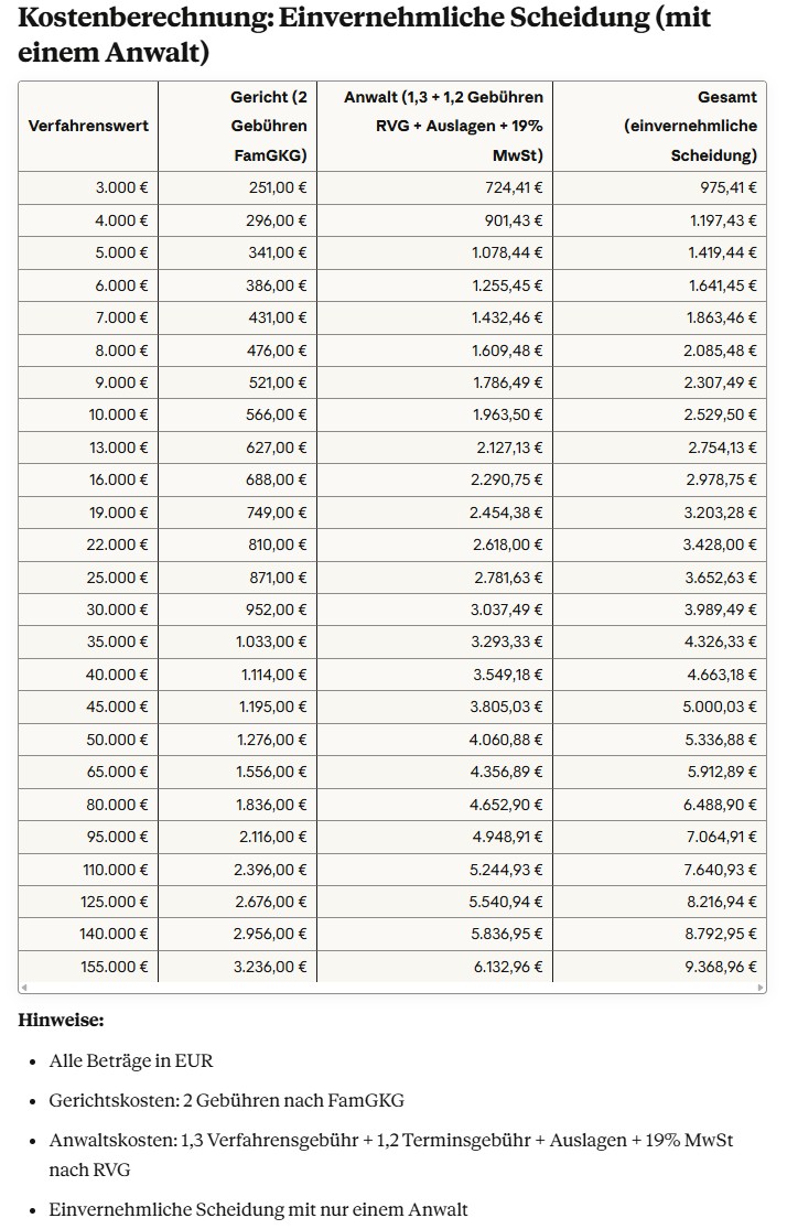 Dieses Formular ist für Sie kostenfrei und unverbindlich. Falls Sie uns anschließend beauftragen möchten, entstehen bei einer einvernehmlichen Scheidung folgende Kosten: