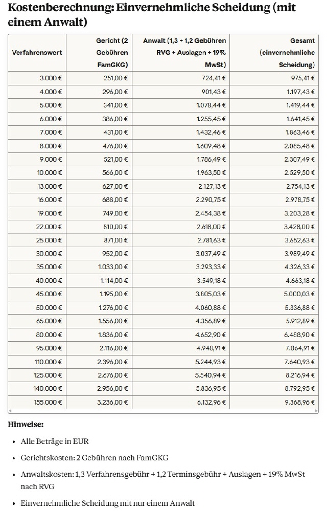 Bei einer einvernehmlichen Scheidung mit einem Anwalt ist das dreifache monatliche Nettoeinkommen beider Ehegatten (mindestens 3.000,- Euro) für den Verfahrenswert maßgeblich und die Kosten sind in diesem Fall wie in der Tabelle dargestellt. Der Versorgungsausgleich erhöht den Verfahrenswert um mindestens 1.000,- Euro. Ferner kann hohes Vermögen der Beteiligten den Verfahrenswert ebenfals erhöhen. Kinder verringern den Verfahrenswert. Der genaue Wert wird erst am Ende des Verfahrens vom Familiengericht fest beschlossen.